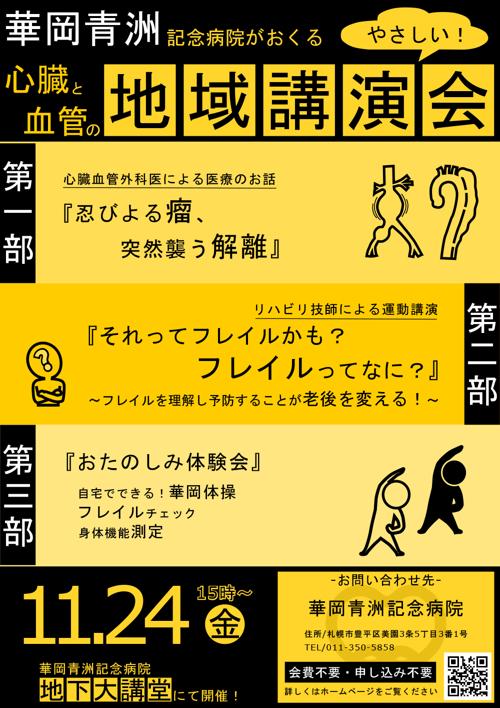 今回は令和6年1月27日に清田区民センターにて心臓血管外科医より大動脈の病気の話を第1部として、そして第2部としてリハビリ部門よりフレイルについての話をいたします。その後もお時間のある方は一緒に“華岡体操“をゆっくりやってみませんか?