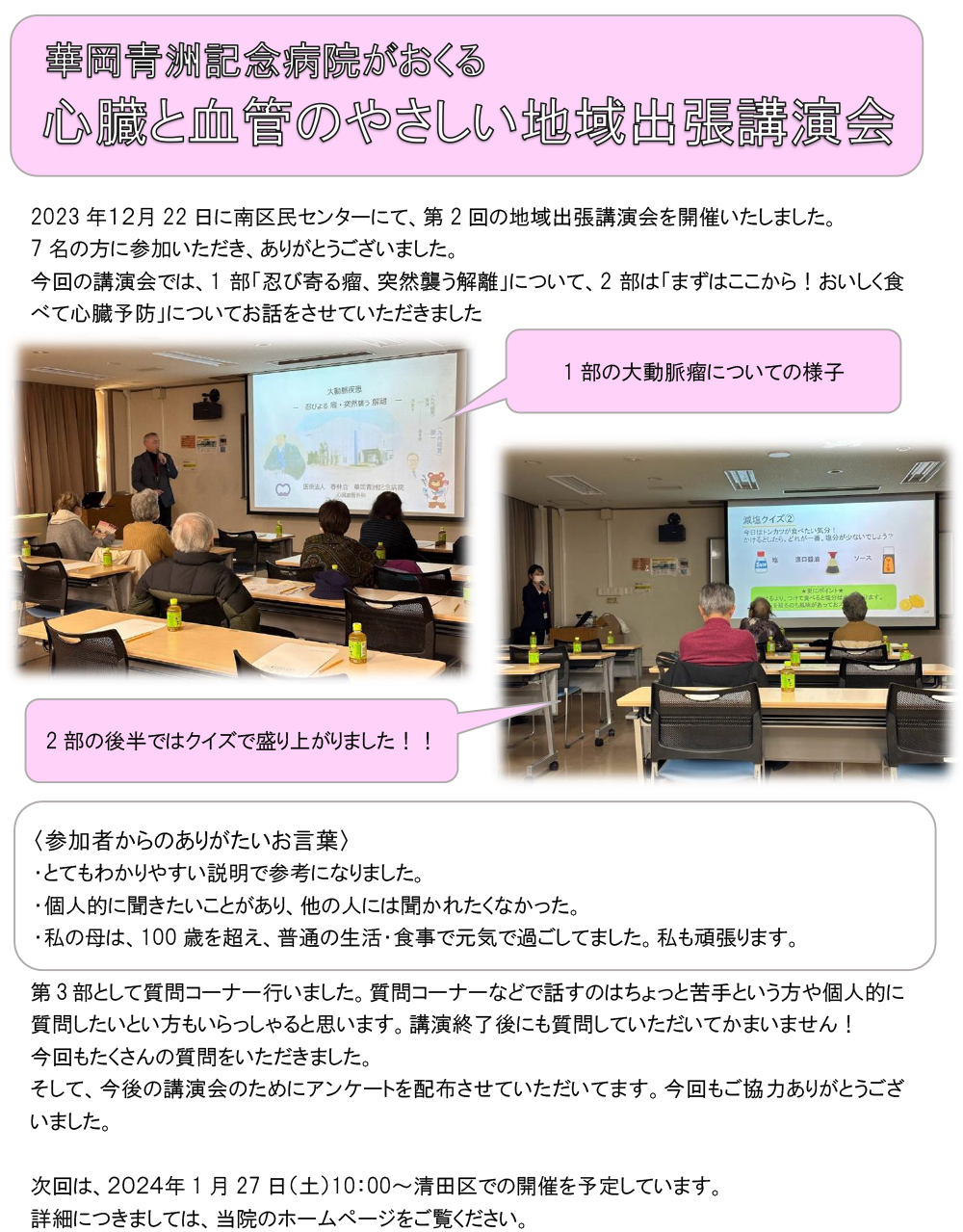 今回は12月22日に南区民センターにて心臓血管外科医より「忍び寄る瘤、突然襲う解離」と題しまして大動脈の病気の話を第1部として、そして第2部として管理栄養士より「まずはここから!おいしく食べて心臓病予防」をお送りいたします。