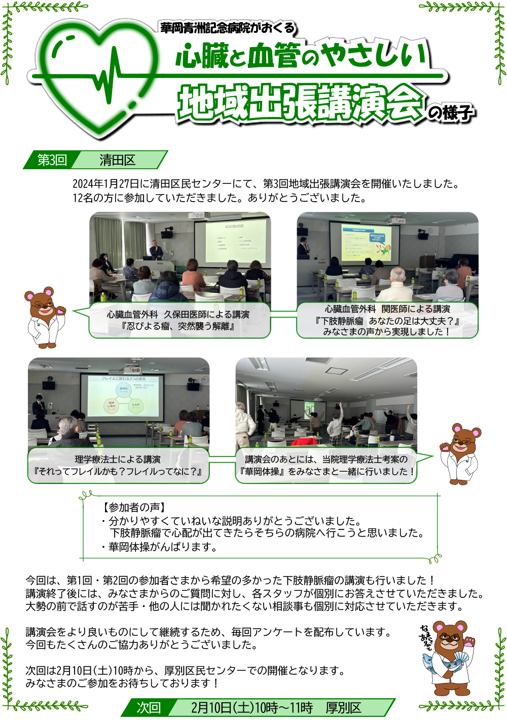 令和5年11月より始まりました地域出張講演会の第3弾を清田区で行わせていただきたいと思います。当院近隣の地域を月に一度伺って、各区民センター視聴覚室などにおいて開催しております。