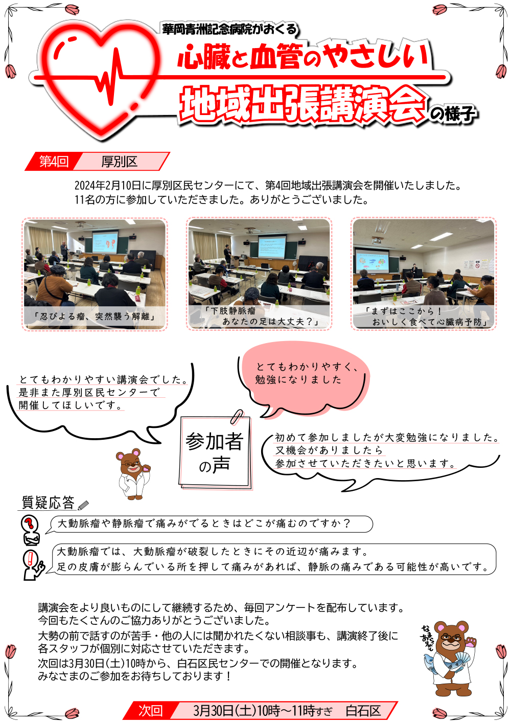 まずはSeason1として大動脈の話を各地域でお話しさせていただき、一巡しましたらSeason2として心臓の話で再度回らせていただく予定です。 今回は2月10日に厚別区民センターにて心臓血管外科医より「忍び寄る瘤、突然襲う解離」「下肢静脈瘤 あなたの足は大丈夫?」と題し第1部として、そして第2部として管理栄養士より「まずはここから!おいしく食べて心臓病予防」をお送りいたします。