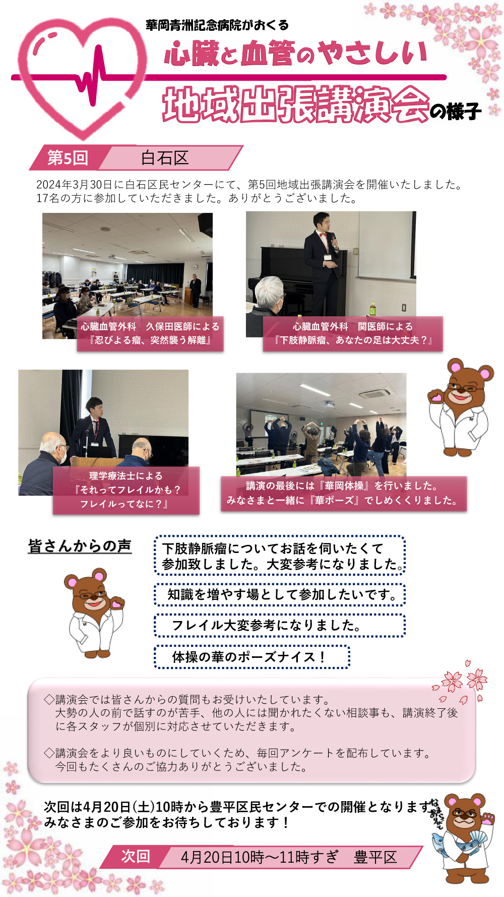 まずはSeason1として大動脈の話を各地域でお話しさせていただき、一巡しましたらSeason2として心臓の話で再度回らせていただく予定です。 今回は3月30日に白石区民センターにて心臓血管外科医より「忍び寄る瘤、突然襲う解離」「下肢静脈瘤 あなたの足は大丈夫?」と題し第1部として、そして第2部としてリハビリ部門よりフレイルについての話をいたします。その後もお時間のある方は一緒に“華岡体操“をゆっくりやってみませんか?