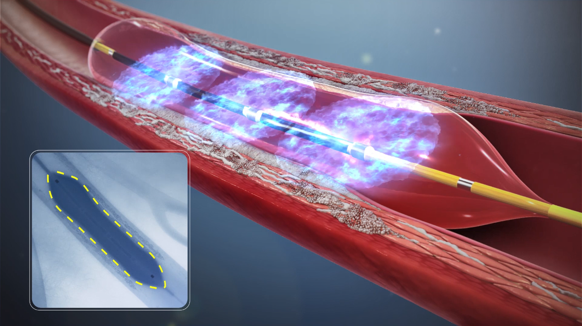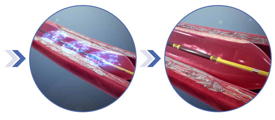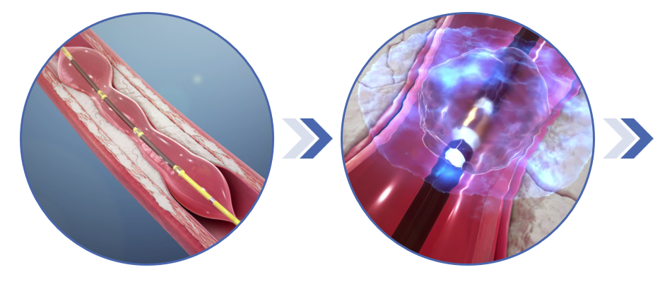 このIVLは、医療用の小さなバルーン(風船)が付いたカテーテルを、冠動脈血管壁の内膜~中膜の間に蓄積した石灰化部分で膨らませ、音圧波で硬い石灰化を砕きます。