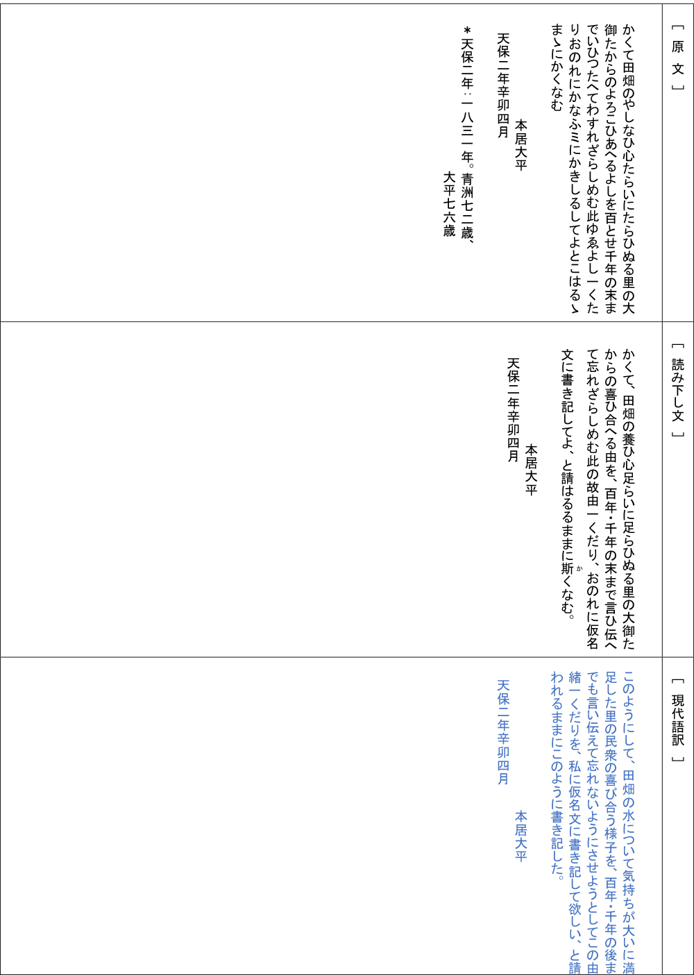 さて宣長は寛政6年・11年藩主に召されて和歌山城内で御前講釈を行っていますが、この時に随行させた優秀な弟子である町人の稲懸大平を、宣長は寛政11年1799年養子(息子春庭が1794年失明した為)にする許可を紀州藩に願い出て、藩から許可されています。この時、稲懸大平改め本居大平は44歳(宝暦6年1756年生まれ)です。(注4)