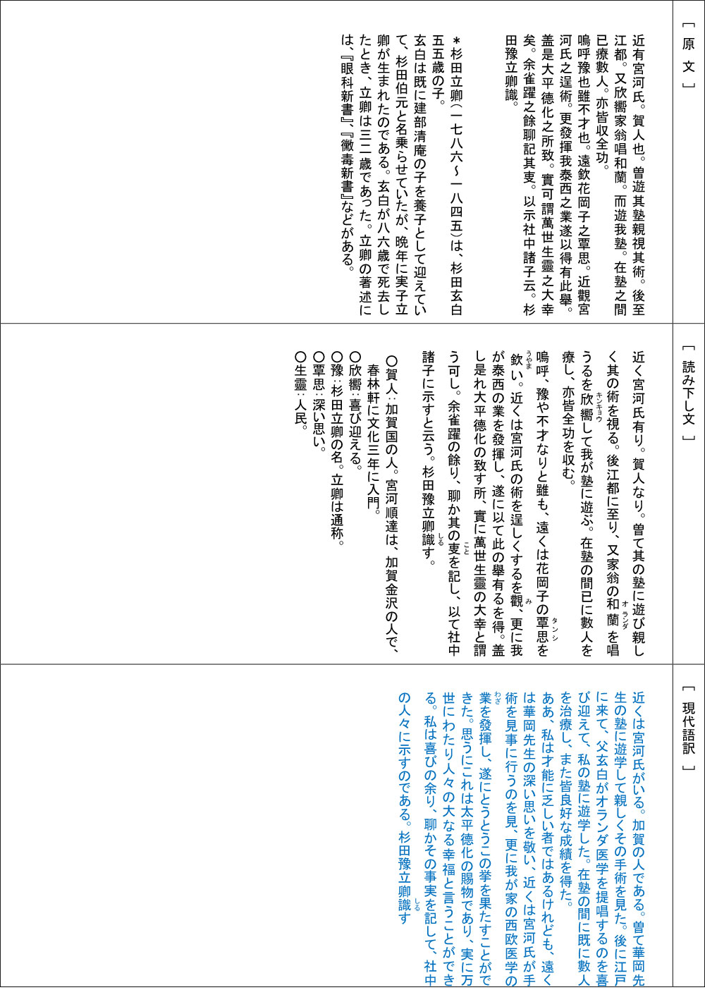 加賀の宮河順達は青洲の医塾春林軒注2を卒業して郷里の金沢に帰りその後数年して江戸に行き今度は杉田玄白の門人になったようです。注3-1