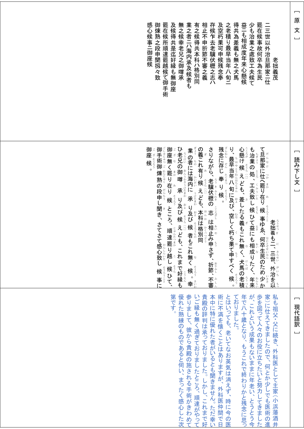 ―――しかし、以下に紹介する書誌により、これは彼の息子杉田立卿をして青洲が実施した全身麻酔の施術方法の習得、そして乳癌手術の施術を教えてもらう必要があり手紙を出したと思われます。