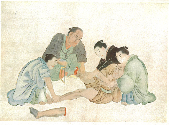 しかし呉秀三著『華岡青洲先生及其外科』(大正12年発行)に収録されている下肢切除手術の絵は男3人で患者を押さえています。