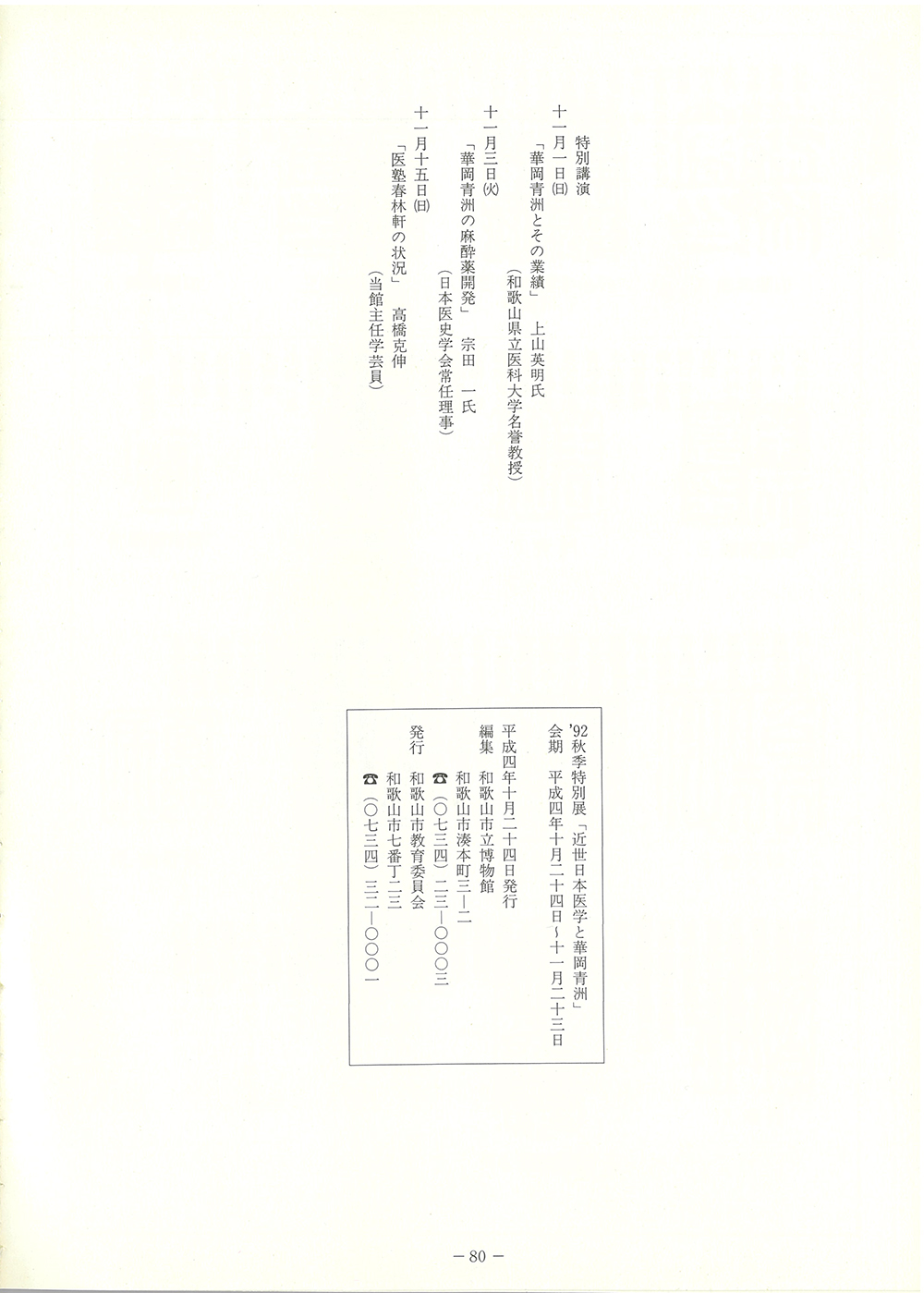 『今回の特別展企画にあたって、市内在住者から1つの証言を得ることができた。それはかつてその人の祖母から聞いた話として、祖母の祖母(つまり証言者から5代前)が華岡青洲の手術を受けたことがあり、その際には新町村(今の五條市本町・新町付近)の船着き場から船で川を下り、平山(筆者注:華岡医塾の春林軒所在地)へ赴いたとの事である。』