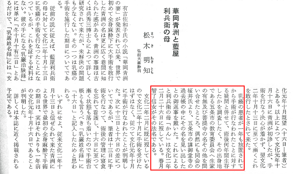 “那賀町史編纂委員会や那賀町華岡青洲をたたえる会でも、かねてから北海道札幌市の華岡家その他各方面に、史料を求め続けていた。ところが、たまたま昭和46年3月毎日新聞社五条通信部の稲田敏雄記者が、五條市の律宗講御堂寺住職森本孝順長老と面談していた時、同寺の過去帳に「春月智了信女、文化2年2月26日・北之町藍屋利兵衛母」とあるのを発見したと聞き、従来の手術日とされる文化2年10月13日以前に、すでに藍屋利兵衛の母勘が死亡している事実に疑問を持ち、五條市長田中勇次郎氏にもその旨を告げた。やがて田中市長から郷土史家北一夫氏を紹介された稲田記者は北氏に調査を依頼し云々”
