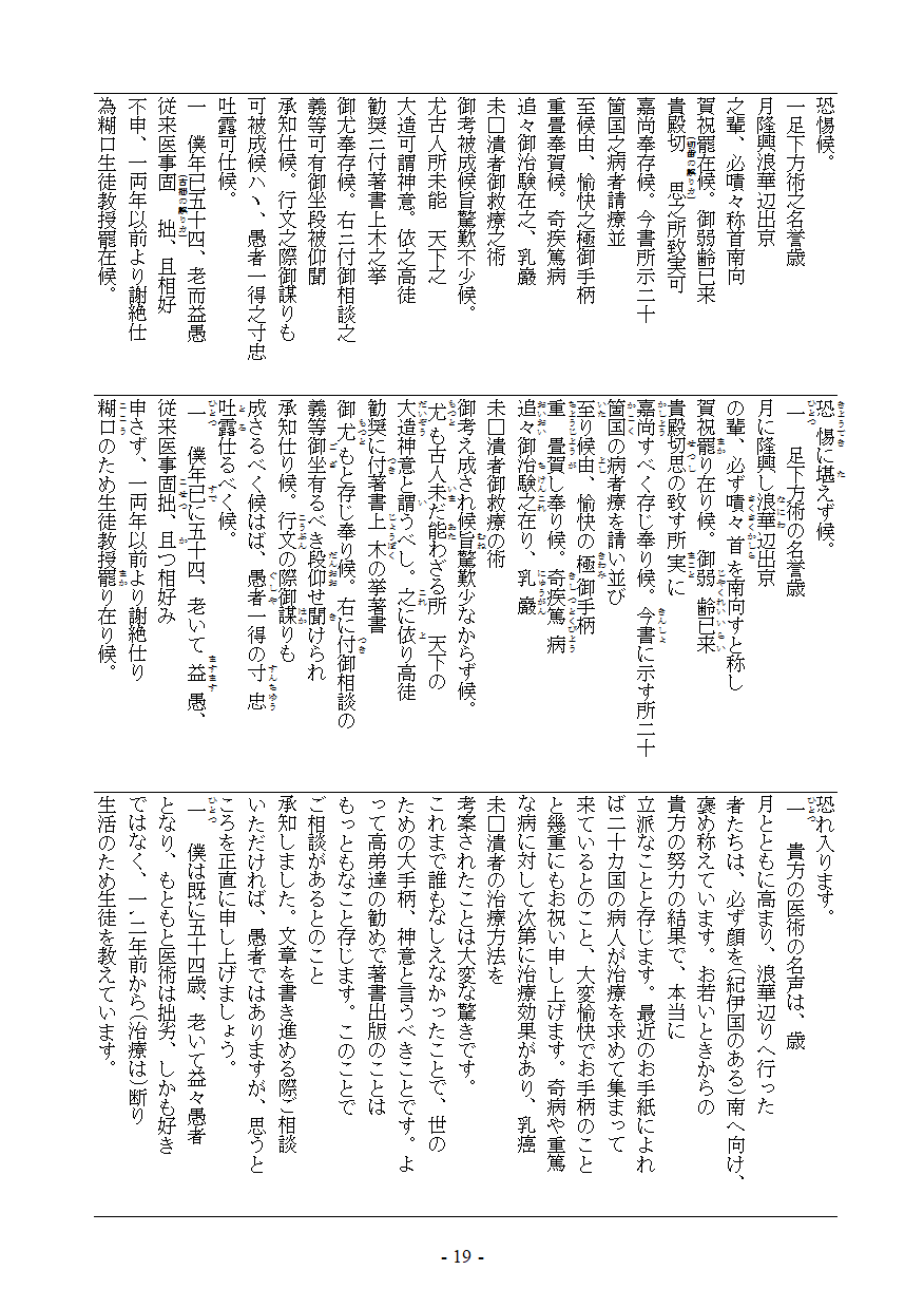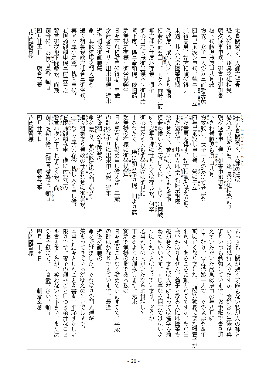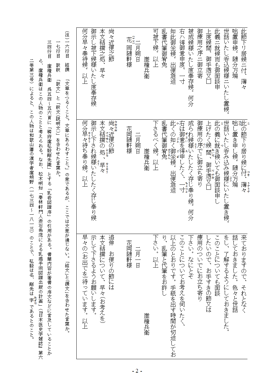 ③出版するかどうか青洲が悩んでいて、若い時の京都遊学時からの先輩医師・儒学者である朝倉氏に手紙で相談した模様で、その後の彼からの返信手紙