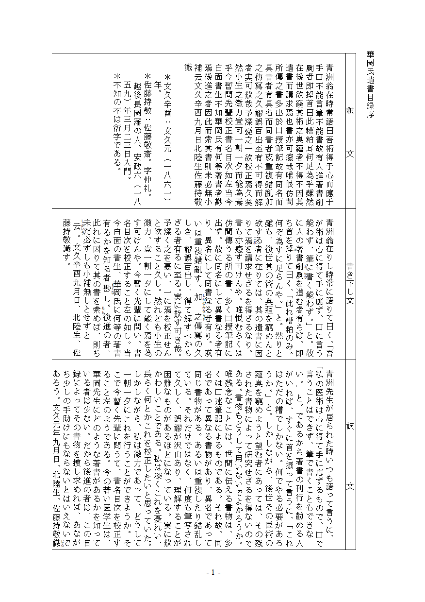 また後世の門人の佐藤持敬注5は文久元年(1861年)に「華岡氏遺書目録」という口述文書の整理書を著してその冒頭の序で次の通り青洲の弁として記述しています。