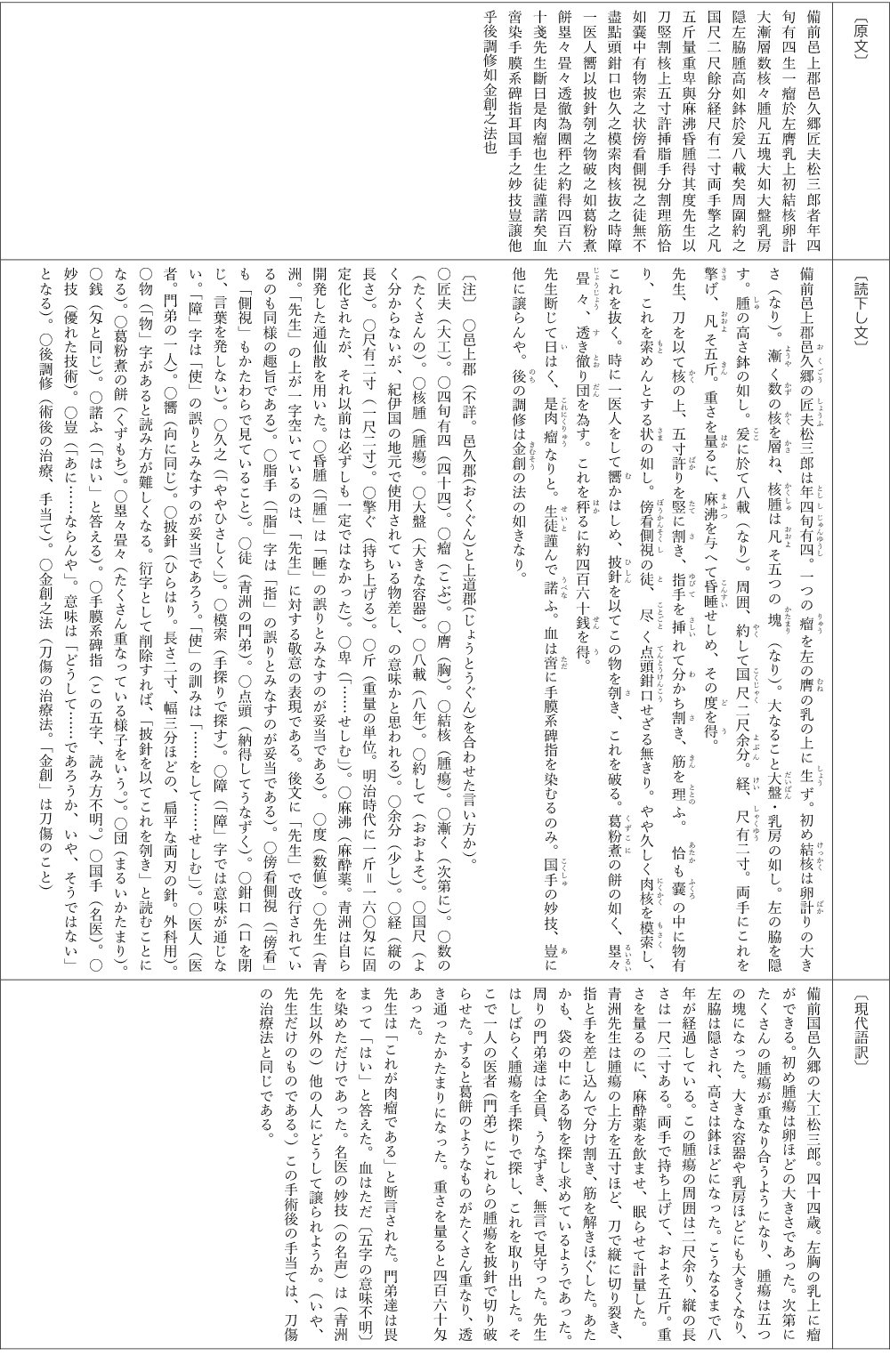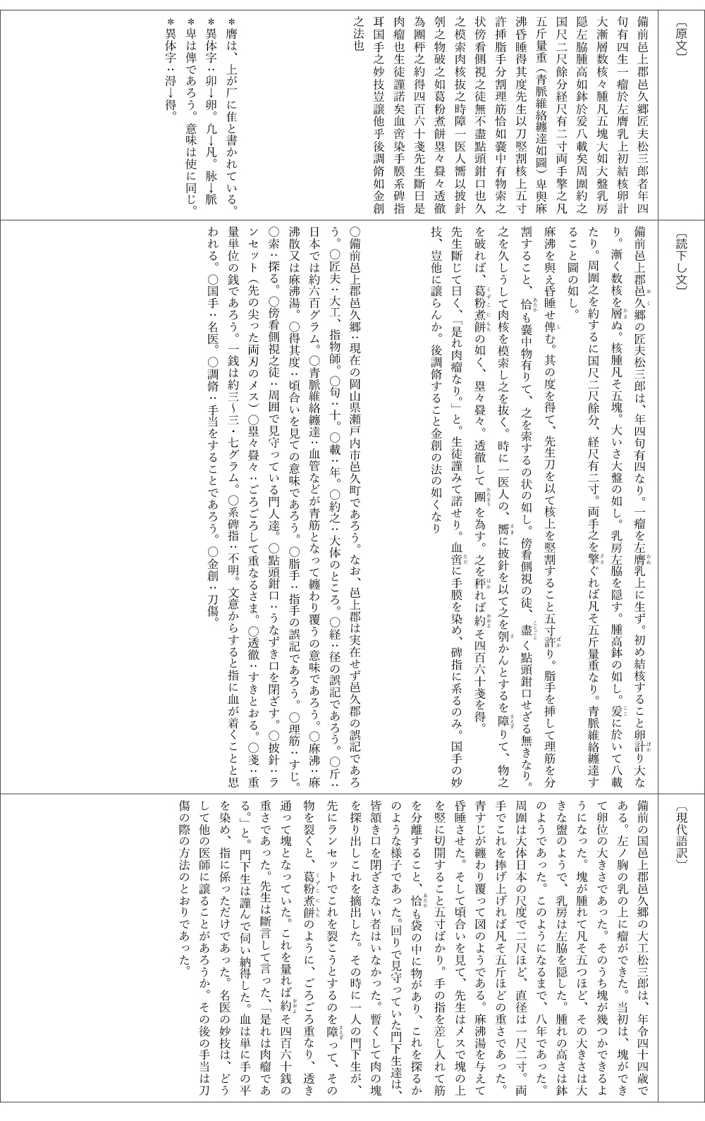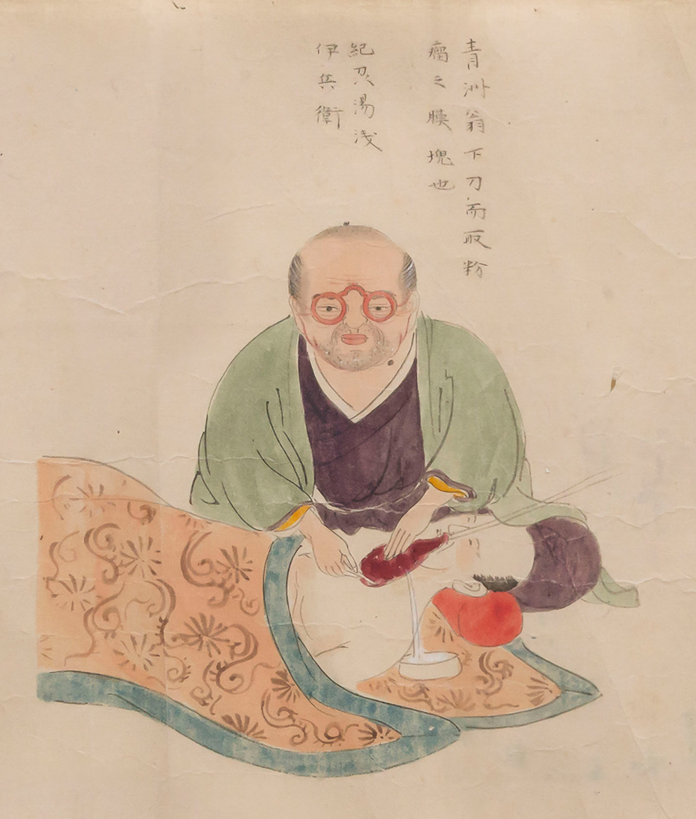 青洲翁(おう)、下刀(げとう)して、粉瘤(ふんりゅう)の膜塊(まくかい)を取るなり。