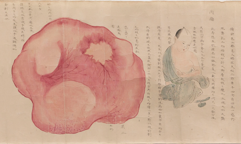 これは四代隨賢の鷺洲が、干支の乙巳=1845年(弘化2年)に施術したものを絵巻の空いている所に後から貼付したと思われるので、それ以前となり、この事からも『彩色奇患之図』は1838年に作成したものと考えられます。恐らく多年にわたり種々の手術時に立ち会いして描画したものを後に絵巻にしたものか、或いはその時々に弟子などの絵心のある人が累々と描写しておいたものを青洲先生が死去した後にその治療方法及び功績保存の為、この年に集大成として画家に描かせたと思料しております。