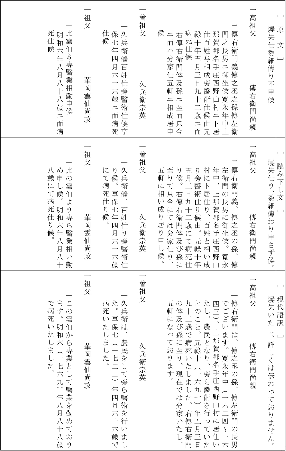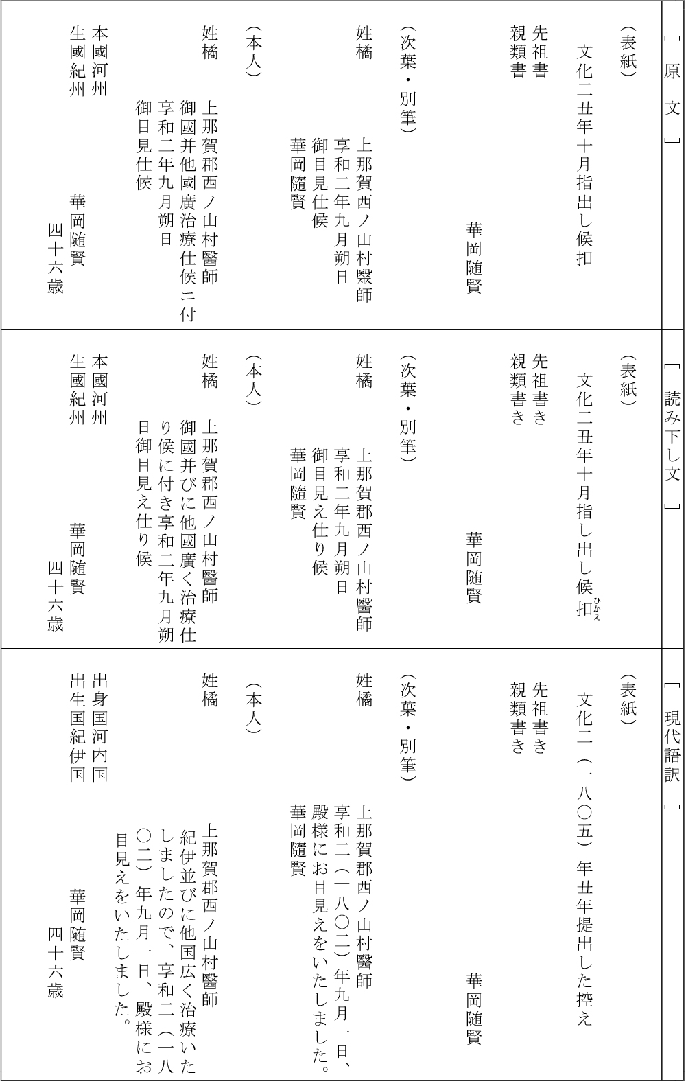 この先祖書にて青洲の履歴を確認し、士分に取立て、帯刀を許可したものと推察できます。注A