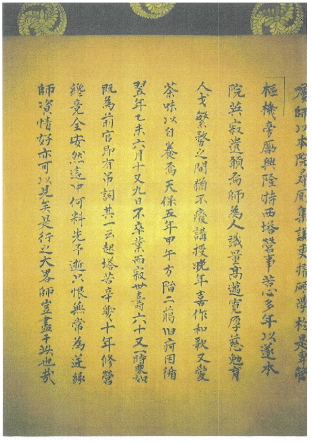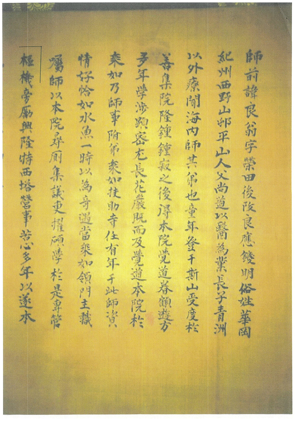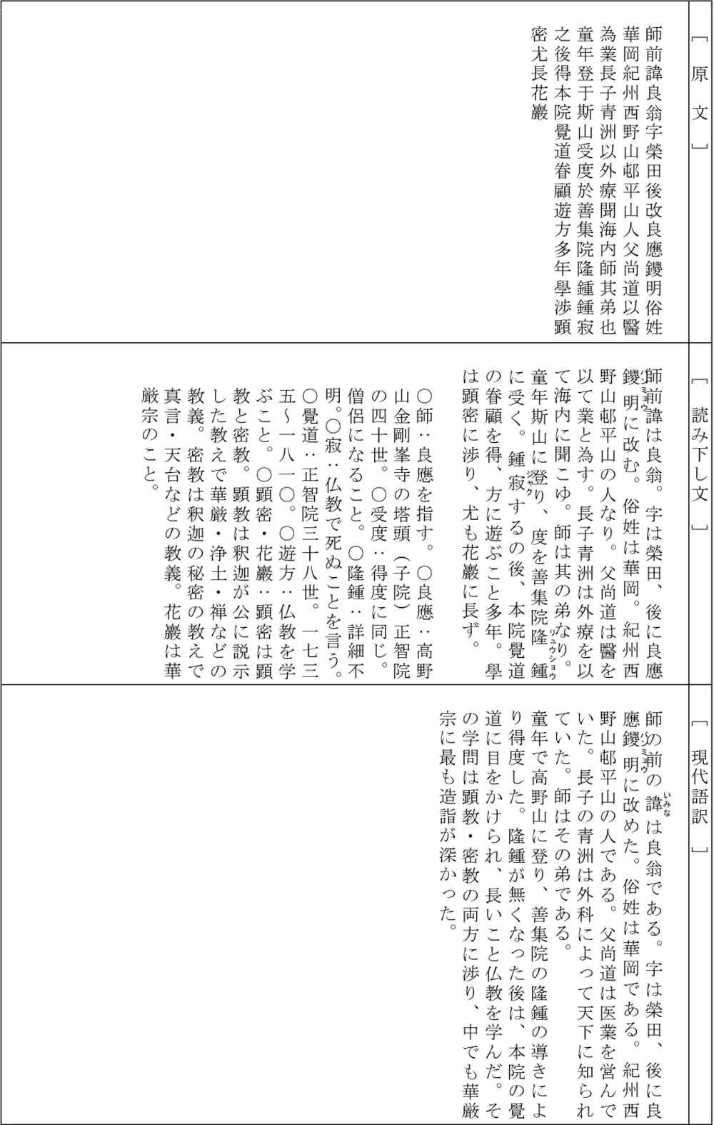 | 注4-1: | のち高野山正智院40代住職となった。(正智院の先代39代は乗如法印といい高野山真言宗358世の管長になった。)今般高野山正智院から栄傳改め良應の掛け軸の写真を送っていただいたのでその画讃の釈文を記す。(青洲と顔立ちがよく似ている。) |