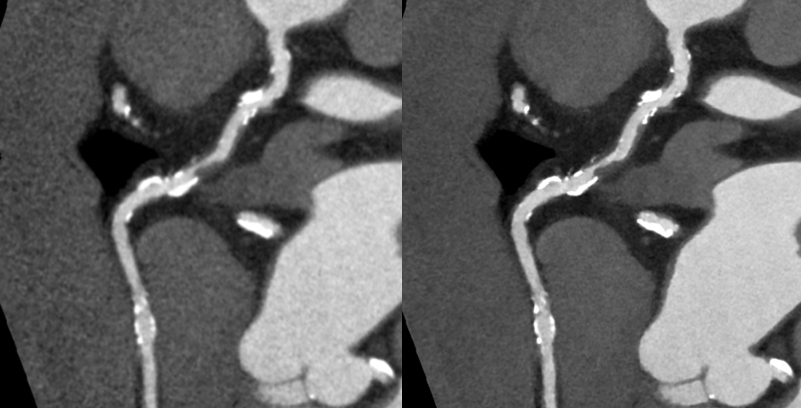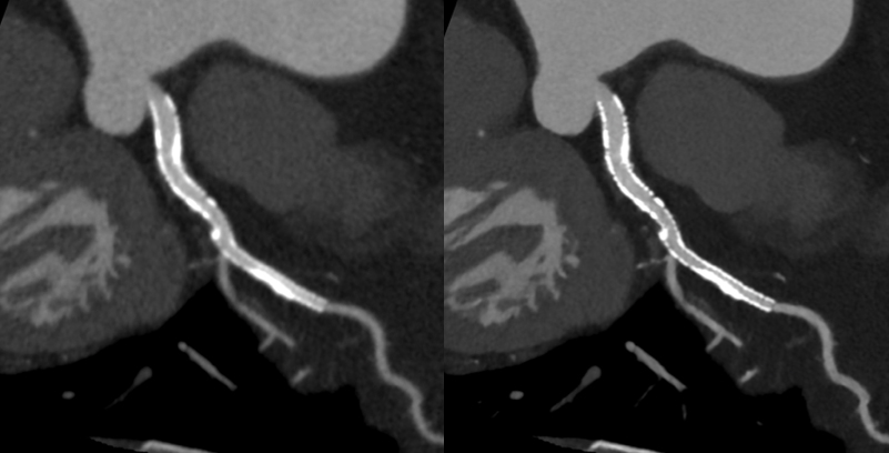 ステント症例:左の従来画像と比較して,右の高精細ディープラーニング画像では小さなステントの内部も明瞭に描出されています。