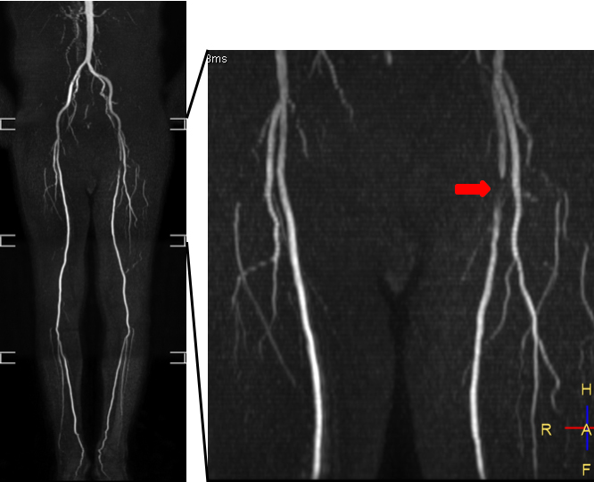 非造影下肢動脈 MRA:造影剤を使用せずに腹部から下肢動脈が描出されており,左浅大腿動脈に狭窄(矢印)を認めます.