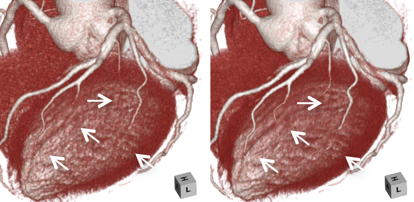 キヤノンメディカルシステムズが開発したPrecise IQ Engine(PIQE)によるディープラーニングの画像によって、冠動脈CT検査で評価が難しい石灰化やステントに接する部分の描出が向上されるため、さらに正確な画像診断が可能となりました。