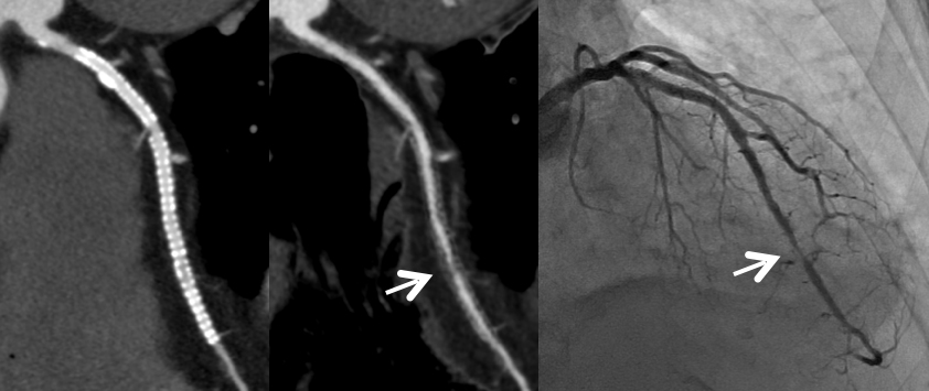 通常の画像(左)ではSTENT内の評価は困難ですが、サブトラクション画像(中央)によって末梢側に高度狭窄を疑われます(矢印)。カテーテル造影(右)でも同様の位置に高度狭窄病変を認めます(矢印)。