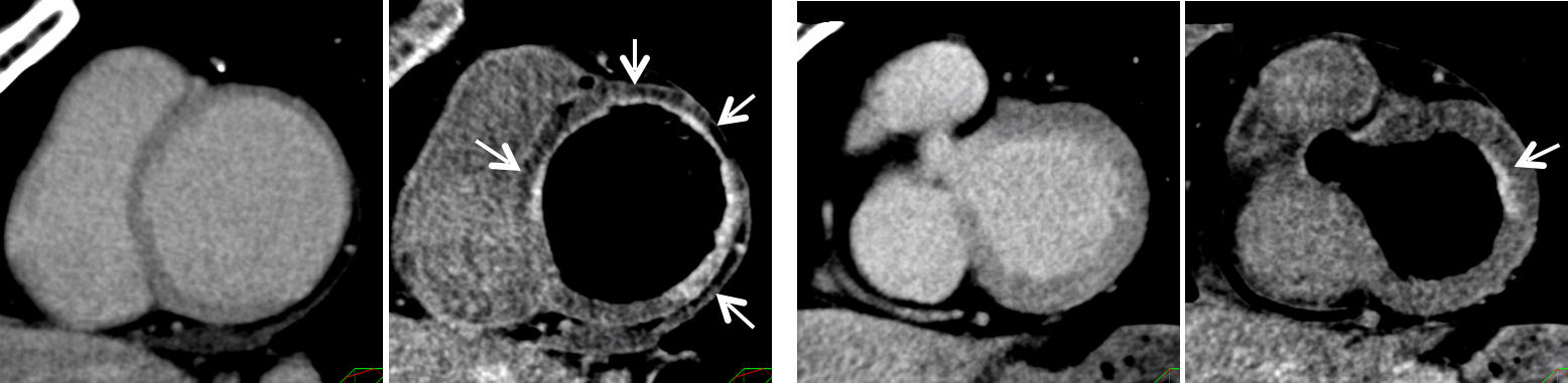 通常の遅延相の画像(左)では、心筋の異常を指摘するのは困難です。SMILIE(右)では、心筋梗塞となっている部分(矢印)が明瞭に描出されています。
