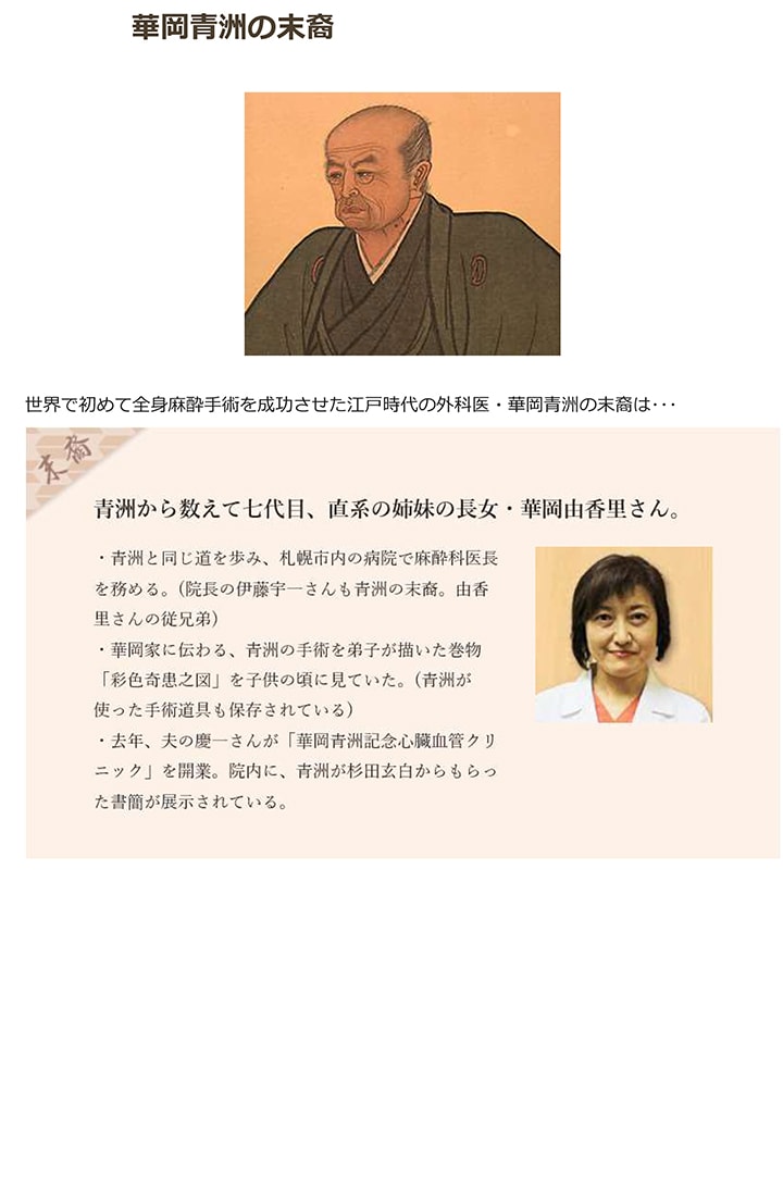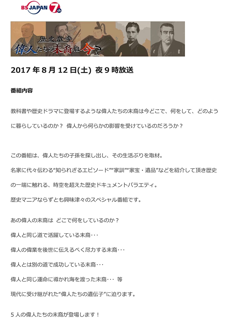 2017年8月12日(土)夜9時放送のBSジャパン(BS 7チャンネル) 歴史散歩 偉人たちの末裔は今?に華岡院長が出演しました。