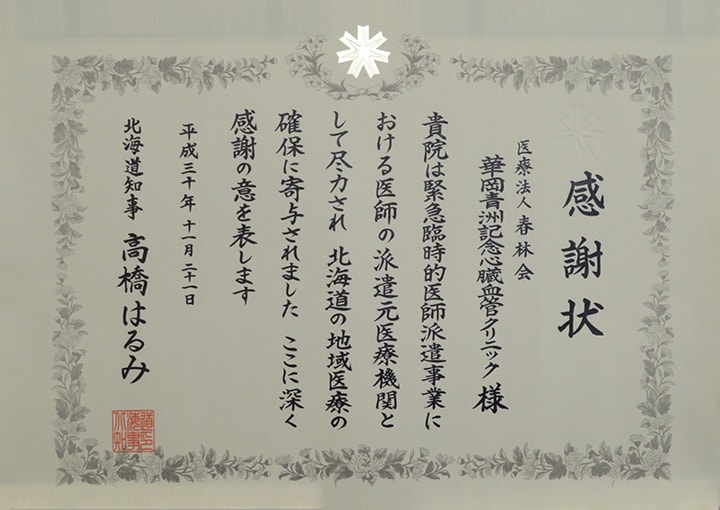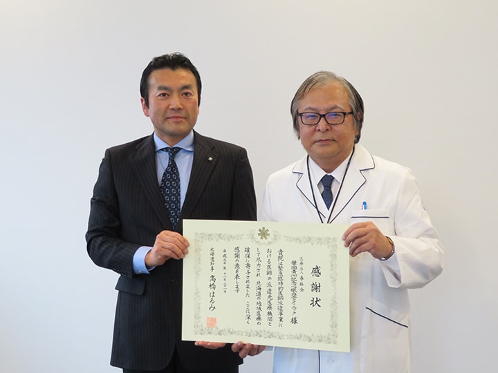 緊急臨時的医師派遣事業に協力医療機関として当院が認定されたことに対し、北海道石狩振興局長より知事感謝状の贈呈を受けました。