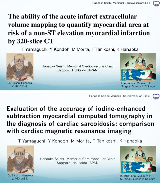 この学会は、演題の採択率が低く狭き門ではありますが、今年は、当院の山口診療技術部長が登録した2演題が採択されました。どちらも、当院で日常的に行なわれているCT検査をまとめた内容で、非虚血性心筋疾患である心サルコイドーシスと非ST上昇型急性心筋梗塞に関する画像所見について、当院の新しい画像評価法を含めた発表でした。