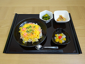 当院で提供しているお食事はすべて減塩対応しており、医師からの指示に基づいた食事内容での提供となっております。 2018年3月より、お米は新潟産コシヒカリ、北海道産ゆめぴりかを月ごとに交互に提供しております。 今後も、食事の品質の向上に努めつつ、季節に合わせた献立や行事食を提供し、患者さんの入院生活の楽しみとなるよう努めてまいります。