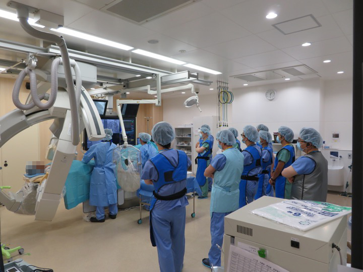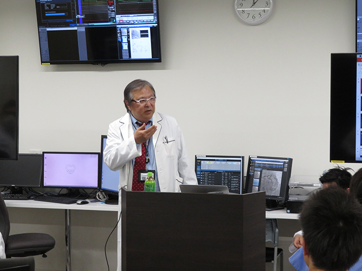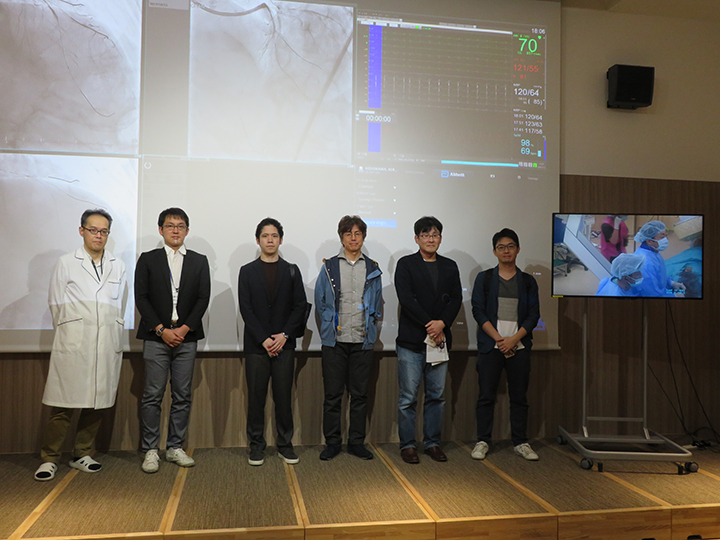 angio装置画像やカテーテル室内映像を別室の大会議室スクリーンへ映し出し、ライブスタイルで行いました。