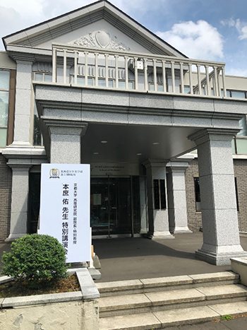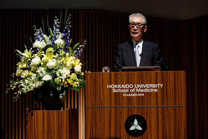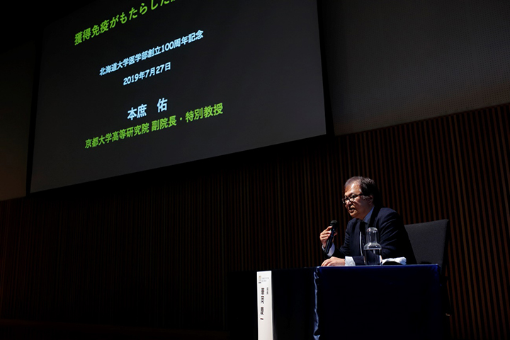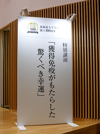 7月27日に北大医学部創立100周年の記念事業として(主催:北海道大学医学部 共催:華岡青洲記念心臓血管クリニック)本庶佑先生による北大教職員や学生、同窓生を対象とした特別講演会「獲得免疫がもたらした驚くべき幸運」を北大医学部学友会館フラテホールで開催しました。