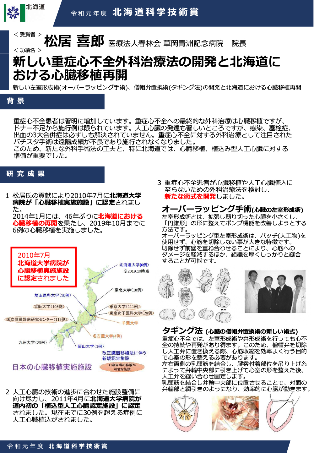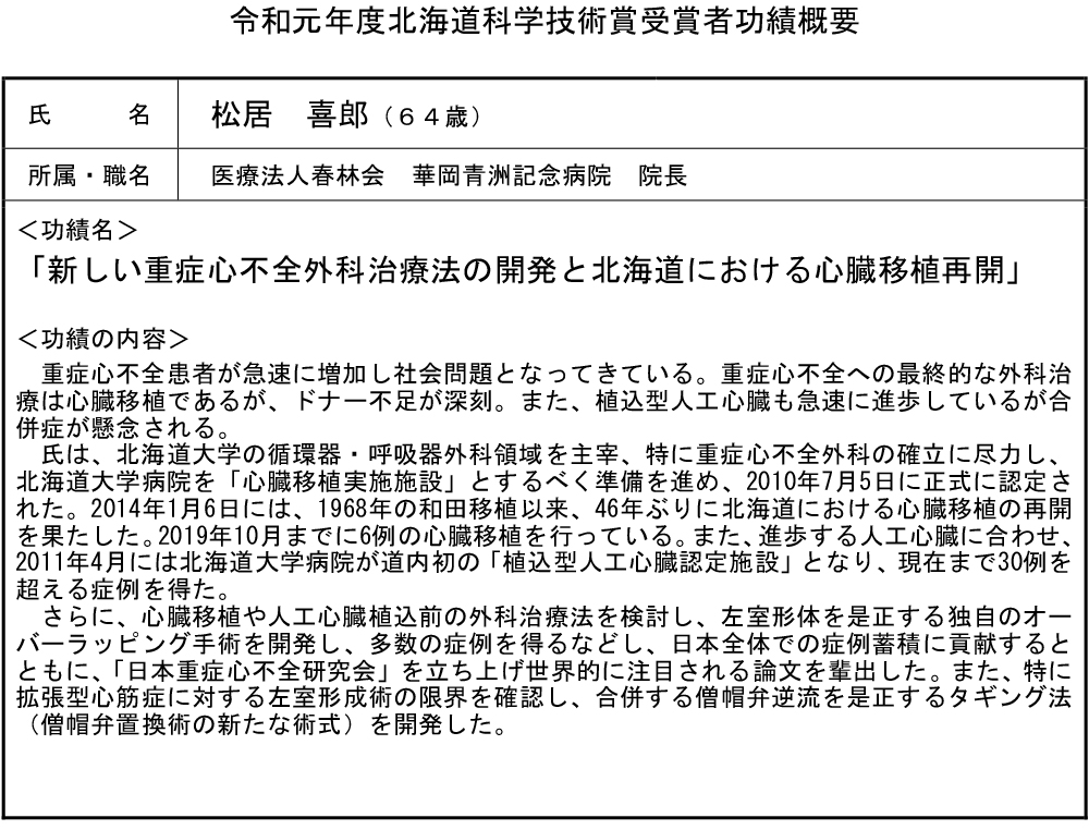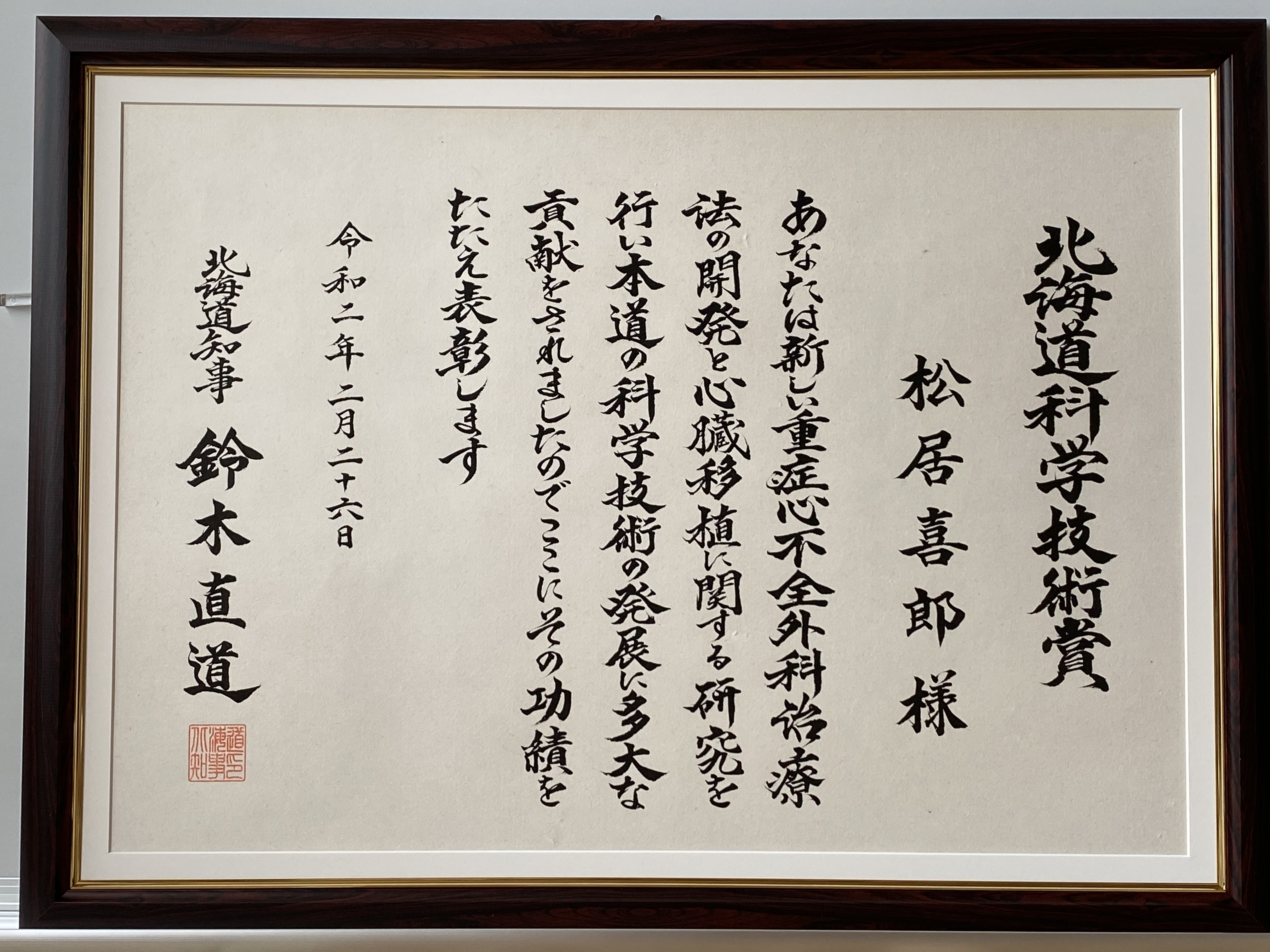 松居院長が「新しい重症心不全外科治療法の開発と北海道における心臓移植再開」についての功績により、北海道知事から北海道科学技術賞を受賞されることとなりました。