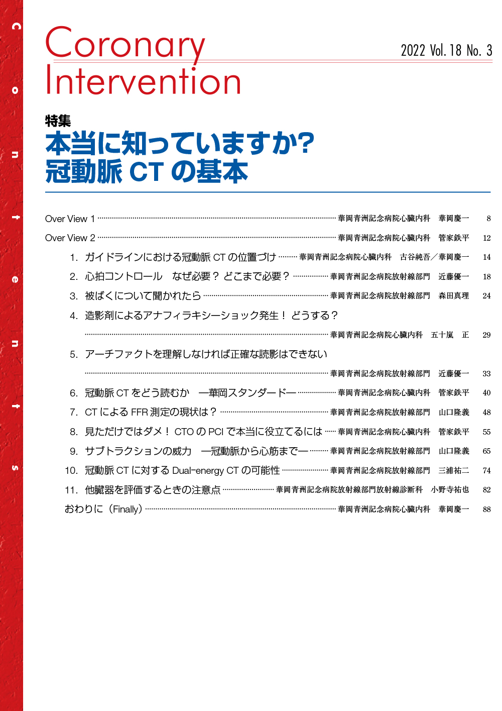 2022年5月31日発行の心臓カテーテル治療領域の専門誌「Coronary Intervention 第18巻第3号」に、当院が提供する冠動脈CTの解析や活用方法などの先進的な取り組みが掲載されました。